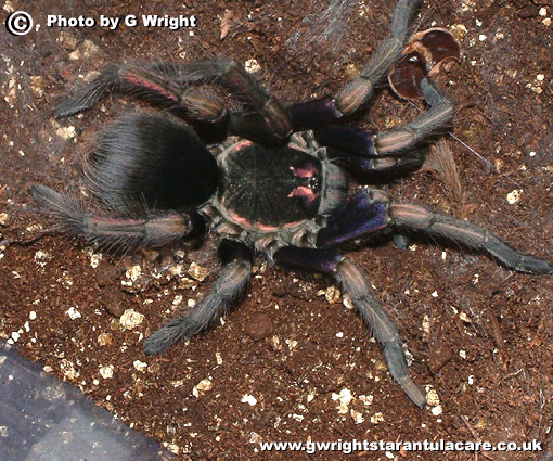 ПРивет! Значит вот такая вот ситуация имеет место быть. Этот самый паук называется Lasiodorides polycuspulatus! Вот, то, что по нему кратко есть. ---------------------- Не крупный вид, достигающий 15-16 см в размахе ног. Условия содержания: влажность 75-80%, температура 26-28°С. Необходимо наличие 4-5 см слоя субстрата, который должен постоянно поддерживаться в увлажненном состоянии. Молодые пауки растут в среднем темпе, достигая половой зрелости к 2-3 годам. Предположительно долгоживущий вид. --------------------- Исходя из того, что это не striatus, как я предполагал, то вероятно этому самцу 1-2, максимум 3 линьки до половозрелой... Значица, надо искать ещё таких ultramarinus'ов самок у народа. На фото то, как этот паук будет выглядеть в последнем возрасте. Фото - Ray Gabriel.