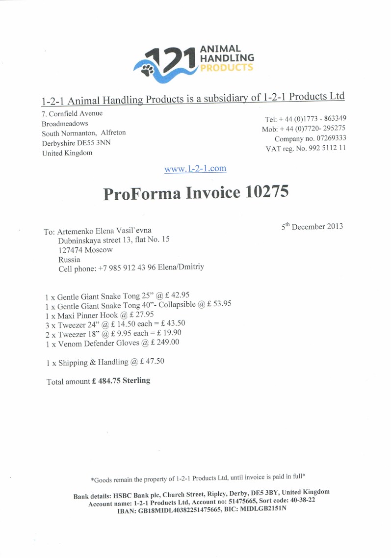 Зоотехник КРС, он же Дмитрий Никитин. Мэйл: zootexnick@yandex.ru Заказал партию амуниции и оборудования от англичан через меня. В его случае дело дошло даже до проформы (прицеплена). В качестве получателя назвал себя и/или некую Артеменко Елену Васильевну (Московский адрес указан в проформе). Всё было подготовлено и упаковано, после чего люди просто исчезли, вместо того, чтобы оплатить, как обещали заказанный товар. Так вот... очередной вариант бизнеса по-русски.