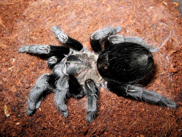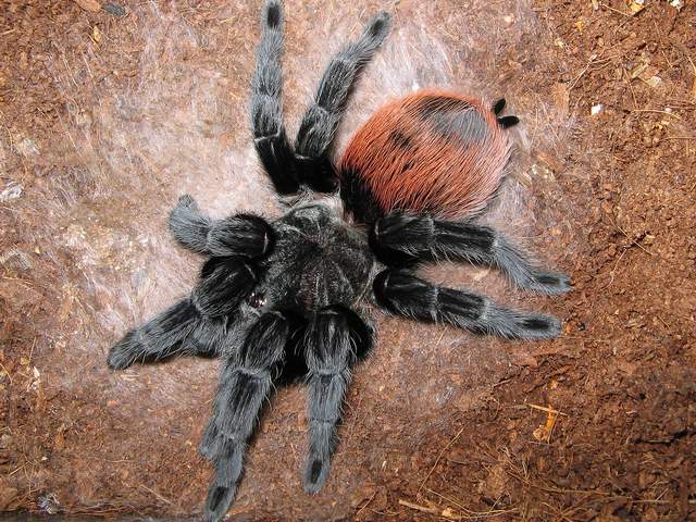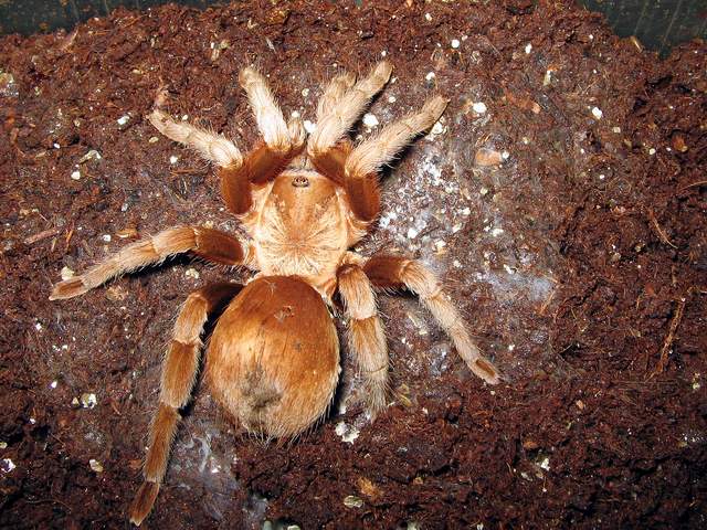 Brachypelma epicureanum, взрослая самка. В свежеполинявшем состоянии хорошо заметен "определительный признак" - округлый патч защитных волосков на задней верхней части абдомена.