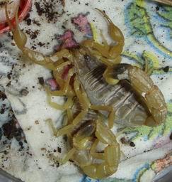 Крупный вид пустынного скорпиона - 7-9 см, яд слабый, очень активный и агрессивный. Продаю в Киве в промежутке с 4 по 11 апреля сего года. по $15, есть пары, возможен обмен на что-нибудь мелкое интересное. вопросы и предложения - на почту