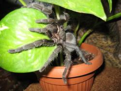 Продолжение совместного содержания Monocentropus balfouri Год назад приобрел двух паучков Л3.Где то в начале лета наконец-таки я выяснил их пол. Оказались оба самца. После определения их пола меня стала мучать мысль о несправедливости выпавшего мне "жребия" - "почему же хотя бы один из пауков не самка?!!!" Решил не полагаться на случай и прикупить себе самку примерно того-же возраста и соответственно вида, но из другого кокона. Очень хочется получить самому развод этих "зверей". Найдя подходящий вариант, в конце лета, я приобрел самку. Недели через две, после адаптации самки, я решил подселить самку к двум братьям и понаблюдать поведение этой колонии. В поведении двух самцов ничего не поменялось, как они раньше жили дружно, так и живут. А вот поведение самки меня настораживает, и посей день. Дня два она носилась по терру, как чумовая. При приближении какого либо паука на расстояние 1 см., она срывалась с места и неслась "куда глаз глядят» (благо терр большой 30х30 см. Экзотеровский). По прошествии недели она немного "успокоилась" ,при приближении собрата, она уже не убегала, она начинала шипеть и бить лапами, отпугивая "врага" и не подпускала к себе сородичей, если те проходили мимо. Зато сама, позволяя себе лазить по братьям, как ей только вздумается и угроз в свой адрес не получала. Главной проблемой для меня стало кормление новой жительницы. Самцов уговаривать долго не надо, бросил корм, выскочил один и корма нет. Бросил корм поближе к другому самцу и этот тоже не растеряется, несколько секунд и корма нет (Едят очень редко). А самке приходилось "под самый нос" корм подпихивать, что бы она съела хоть что-нибудь, и если она хватает корм, то это праздник. Теперь квартирный вопрос. У меня в терре стоит коряга, прислонённая к стеклу под углом. Под этой корягой и находиться лежбище пауков. Так у самки есть свой определенный уголок, примерно 3х3 см., куда не один самец не подходит, точнее сказать не может подойти . Самка "встает в позу", шипит и топочет лапками. Себе она позволяет пройтись по всему жилью , стоит отметить, все жилье под корягой составляет примерно 7х6х7 см. На сегоднешний день все тихо и мирно. За это время глобальных войн замечено не было. Самцы полиняли и стали еще краше (Л8), а вот самка пока не линяла(8Л + - 1Л). Вот, вкратце, наиболее яркие моменты в поведении моей колонии. Вывод, который я сделал для себя, прост: даже колониальные виды должны содержаться совместно с раннего возраста. (Чем младше, тем лучше) Совместное содержание прерывать пока не буду, а там посмотрим.