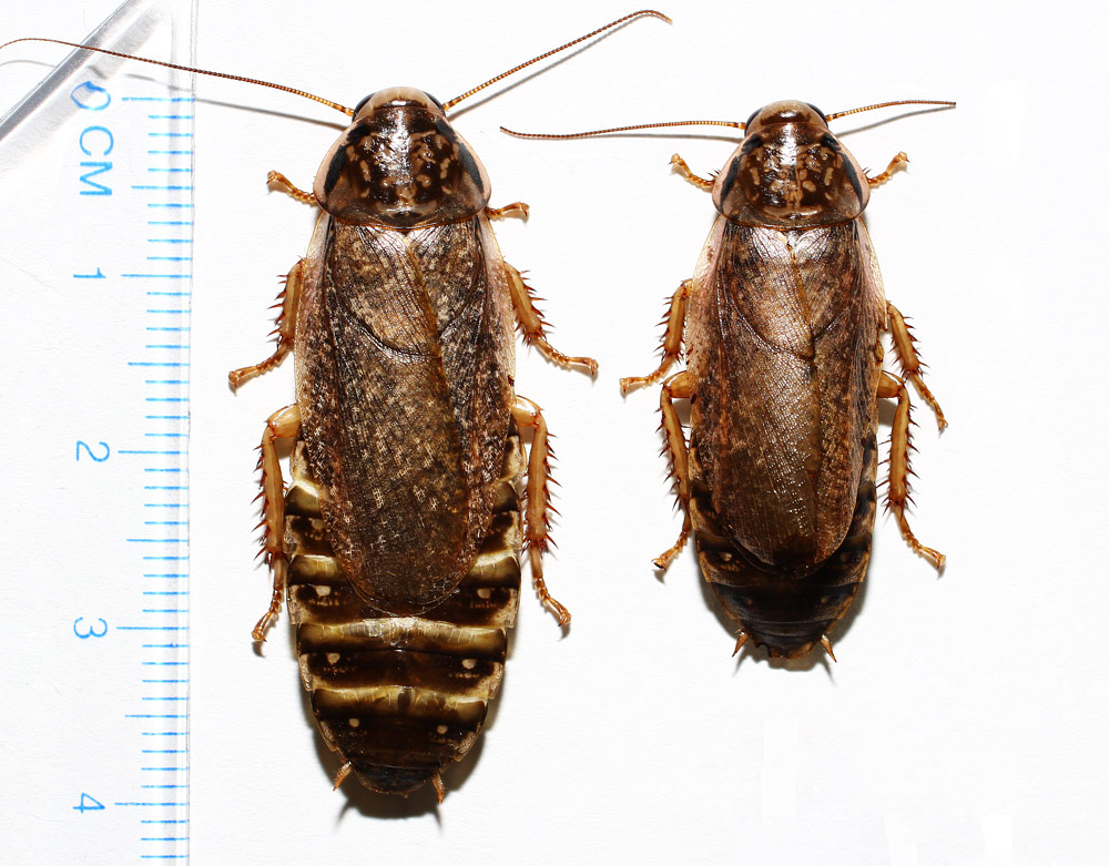 MagBeetls Опубликовано 24 Января, 2012 в 16:35 Автор Жалоба Опубликовано 24 Января, 2012 в 16:35 Сегодня неожиданно погибла одна из огромных самок участвующих в опыте с облучением ультрафиолетом. Она ходила беременная, хорошо ела, стала сильно пузатой, и вот-вот должна была родить, но... Обнаружил хладный труп без видимых на то причин. Сфотографировал ее вместе с крупной беременной самкой из контрольной популяции. Так очевидна разница в размерах и хорошо иллюстрируется изменение габитуса. Интересно, что большинство самок участвующих в опыте претерпели некоторые изменения в пропорциях тела. У них изначально ощутимо увеличено брюшко, а на поздних сроках беременности оно раздувается невероятно. Им даже ползать тяжко - невероятное брюхо волочится увесистой колбасой. Смею предположить, что происходит подобное по причине увеличения количества тараканят в оотеке, что пропорционально увеличивает последнюю в объеме. Размер новорожденных тараканчиков тоже значительно больше нормы.